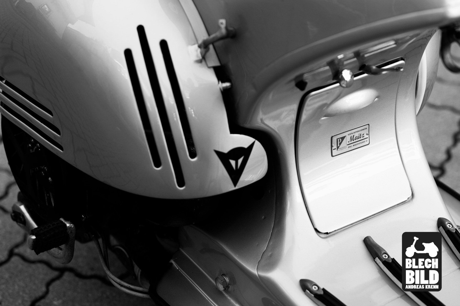 Die Maitz GS! Franz Maitz hatte so eine GS. Eine Sonder-Rennvespa angefertigt von Piaggio für Franz Maitz. Franz ist damit in Graz das Schlossbergrennen gefahren. Das Foto vom Rennen hängt im Guggenheim Museum in N.Y. . Franz zeigte mir mal ein Foto wo er vor seinen Bild im Guggenheim zu sehen ist. Ich kenne jetzt schon 3 Leute die sagen Sie haben die Vespa in Ihren Besitz. Es wird wohl ewig ein Mythos bleiben. Auf jeden Fall konnte ich diese schöne Vespa bei der Giro 2012 fotografieren. Wer wohl der echte Besitzer der Vespa ist kann ich nicht sagen. Oder ob die Vespa noch immer in der Nähe von Graz auf der Alm steht wie Franz mir immer versichert hat.